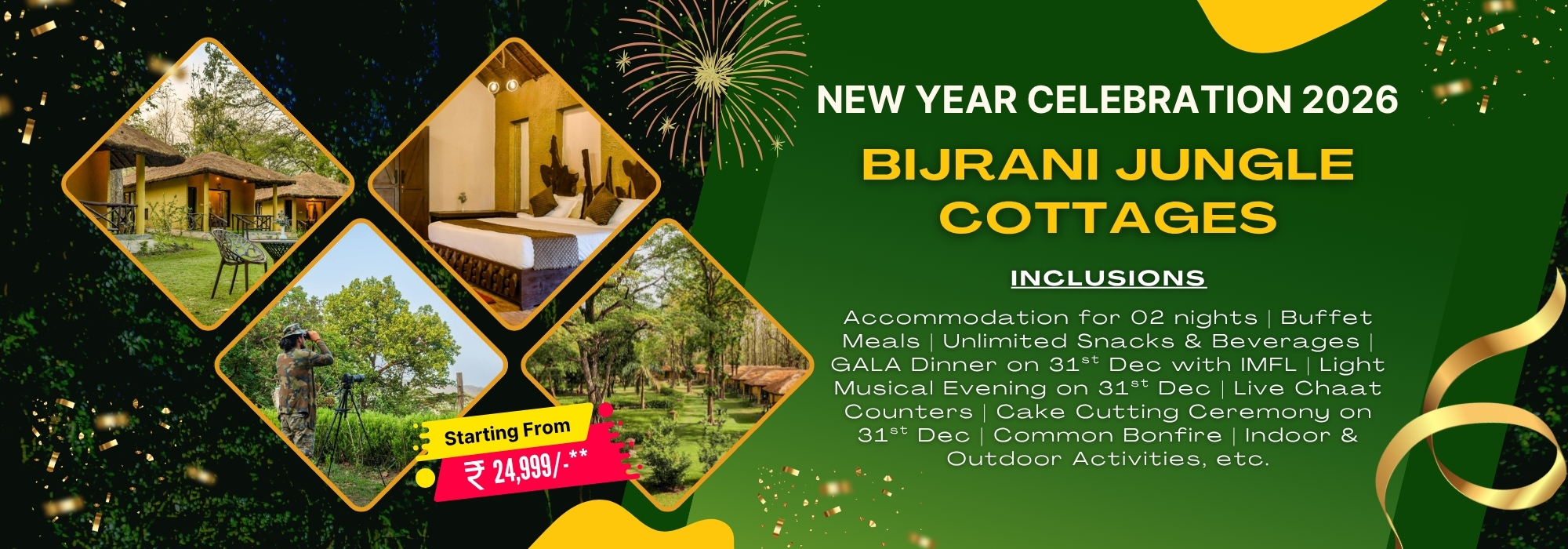Inclusion :Bonfire, Eve Light Music with Snacks, 03 + 03 Snacks, Gala Dinner, DJ with Dance Floor, Prize & Surprise, New Year Celebration with Cake Cutting, etc